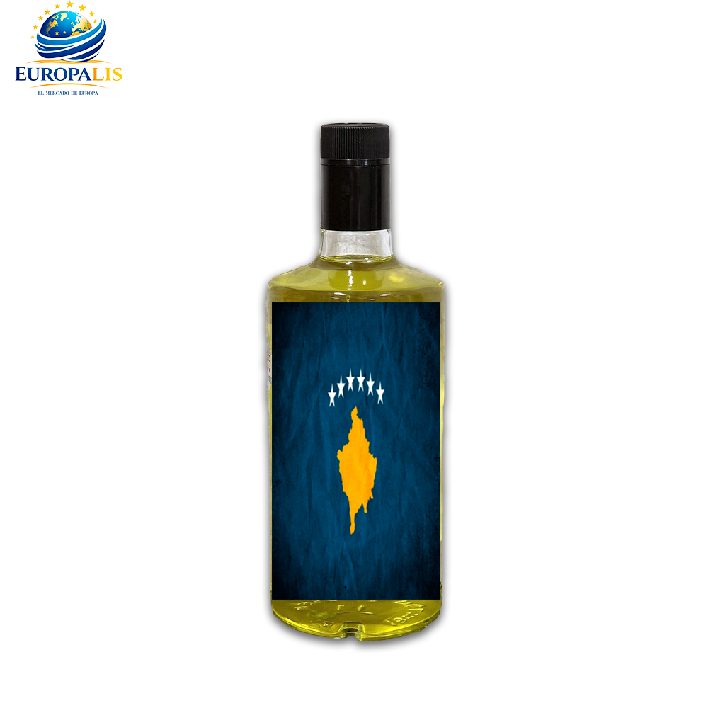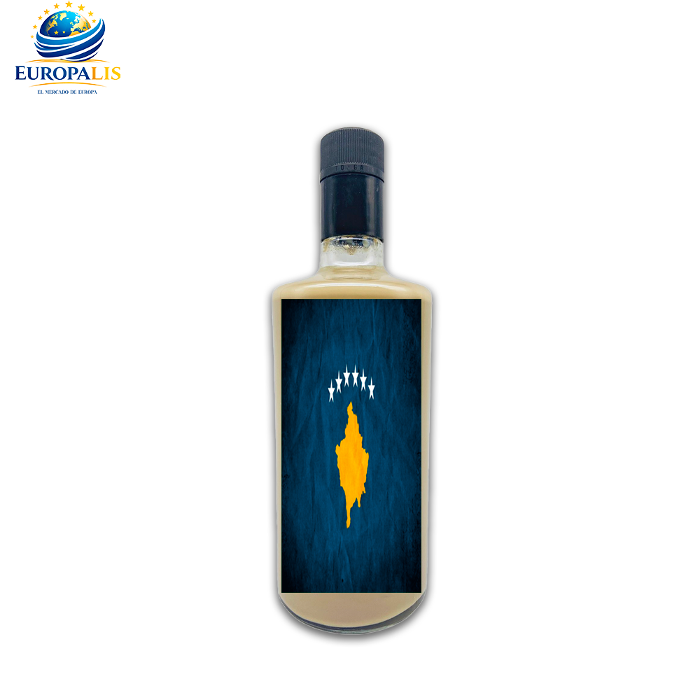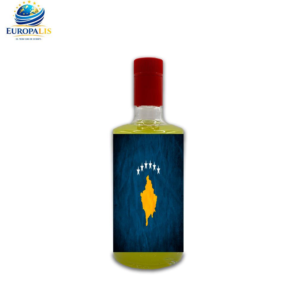 Selección de licores artesanales premium con etiquetas de la bandera de Kosovo. Cuatro variedades: Pacharán, Hiervas, Café y Limón-Chelo.